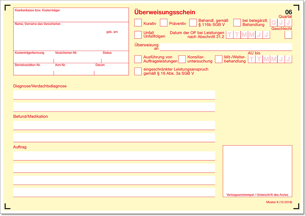 Für eine eingeleitete Mitbehandlung durch einen Fachkollegen können Sie die Überweisung per E-Mail bestellen, indem Sie das rechts stehende Formular ausfüllen: